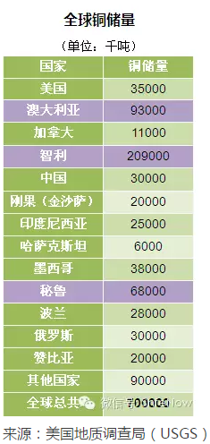 根據(jù)美國資源調(diào)查局2015年數(shù)據(jù)顯示,全球銅儲量共約為7億噸。其中包括:智利2.09億噸,澳大利亞0.93億噸,秘魯0.68億噸,美國0.35億噸,墨西哥0.38億噸,中國0.3億噸,俄羅斯0.3億噸,印度尼西亞0.25億噸,波蘭0.26億噸,贊比亞0.2億噸,剛果(金沙薩)0.2億噸,加拿大0.11億噸,哈薩克斯坦0.06億噸,其他國家0.9億噸。