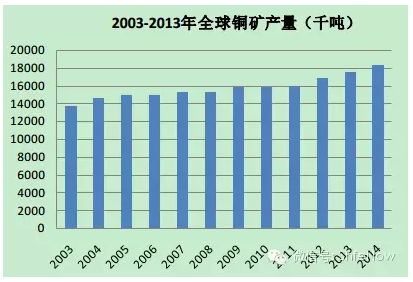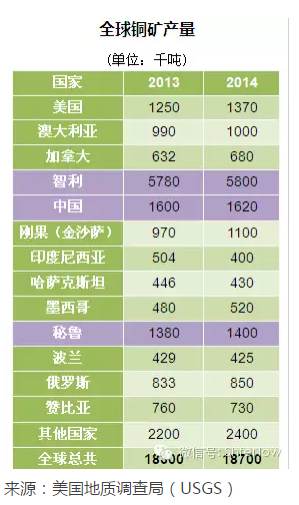 根據(jù)美國資源調(diào)查局2015年數(shù)據(jù)顯示,2013、2014年全球銅產(chǎn)量如下:
