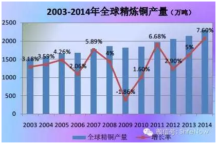 世界金屬統(tǒng)計局(WBMS)公布的報告顯示,2014年全球精煉銅產(chǎn)量增加至2301.0萬噸,較2013年增加7.6%;其中中國產(chǎn)量增幅最大,增加了116.9萬噸,印度產(chǎn)量增加14.5萬噸,贊比亞產(chǎn)量增加11萬噸。2014年全年消費(fèi)量為2290.5萬噸,2013年為2104萬噸。2014年全球銅市供應(yīng)過剩10.5萬噸,2013年供應(yīng)過剩28.3萬噸。2014年銅庫存下降21萬噸。