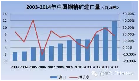 中國是世界最大的銅消費(fèi)國,而銅的儲量和基礎(chǔ)儲量分別僅占世界總量的5.53%和6.67%,對于銅精礦的需求量只能依靠大量進(jìn)口才能滿足。從2003年到2014年中國銅精礦進(jìn)口量,從266.7萬噸增加到1182萬噸。
