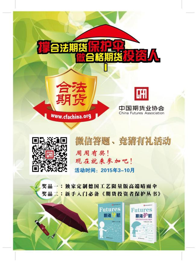 各會(huì)員單位:為深入貫徹《關(guān)于進(jìn)一步加強(qiáng)期貨經(jīng)營(yíng)機(jī)構(gòu)創(chuàng)新發(fā)展的若干意見》有關(guān)投資者保護(hù)的指示精神,推動(dòng)會(huì)員單位加強(qiáng)投資者教育工作,開展內(nèi)容豐富、投資者喜聞樂(lè)見的投教活動(dòng),中國(guó)期貨業(yè)協(xié)會(huì)決定開展“撐合法期貨保護(hù)傘、做合格期貨投資人”微信有獎(jiǎng)答題活動(dòng)。一、活動(dòng)宗旨針對(duì)中小投資者宣傳“合法期貨”概念,增強(qiáng)守法合規(guī)意識(shí);貫徹適當(dāng)性制度,樹立風(fēng)險(xiǎn)投資理念,培養(yǎng)成熟理性的“合格投資者”。二、活動(dòng)形式采取公眾參與、微信答題、抽取獎(jiǎng)品為主要形式。協(xié)會(huì)官方微信設(shè)置微信答題應(yīng)用程序,參與者手機(jī)關(guān)注中國(guó)期貨業(yè)協(xié)會(huì)官方微信號(hào)“中期協(xié)發(fā)布”(ZGQHYXH)或掃二維碼即可參與答題抽獎(jiǎng)。三、參與對(duì)象以中小投資者特別是潛在投資者為主要目標(biāo)對(duì)象。從業(yè)人員、社會(huì)公眾均可參與。四、舉辦時(shí)間2015年3月開始,至10月底結(jié)束。每周兩期,周二和周五發(fā)布題目,答題時(shí)間分別截止到周五和次周一零時(shí)。2015年2月為答題測(cè)試及試運(yùn)行期。五、參與規(guī)則1.出題范圍:題目來(lái)源為期貨投資者系列叢書——《期海導(dǎo)航》和《期海護(hù)航》,主要內(nèi)容為期貨基礎(chǔ)知識(shí)與政策法規(guī)。2.題型:題目均為單項(xiàng)選擇題,選項(xiàng)3個(gè),每期3道題。3.微信答題抽獎(jiǎng)步驟及規(guī)則:第一步:參與者打開微信答題頁(yè)面查看題目;氐焦娞(hào),先輸入推薦單位(中期協(xié)會(huì)員單位)簡(jiǎn)寫(如推薦單位非中期協(xié)會(huì)員單位或無(wú)單位,可填寫“中期協(xié)”);填寫匹配,系統(tǒng)會(huì)自動(dòng)給出提示:“請(qǐng)輸入您的答案選項(xiàng)(按答題順序依次輸入三個(gè)字母選項(xiàng)答案,大小寫均可)”;第二步:輸入答案后,系統(tǒng)判斷答題全部正確即進(jìn)入“刮刮卡”抽獎(jiǎng)環(huán)節(jié);第三步:中獎(jiǎng)?wù)咝柙谥歇?jiǎng)頁(yè)面填寫手機(jī)、微信號(hào)等個(gè)人信息,并按“中獎(jiǎng):真實(shí)姓名+手機(jī)號(hào)+郵寄地址”的格式回復(fù)至“中期協(xié)發(fā)布”公眾號(hào),未按改格式的一律算作無(wú)效回復(fù)。4.注意事項(xiàng):(1)每個(gè)微信號(hào)每期只能參與一次答題;(2)參與者必須按照輸入推薦單位→輸入正確答案→抽獎(jiǎng)的順序進(jìn)行,如不按順序抽獎(jiǎng)結(jié)果無(wú)效。(3)推薦單位簡(jiǎn)寫、答題材料均可在微信菜單、活動(dòng)頁(yè)面查找。六、獎(jiǎng)項(xiàng)設(shè)置1.個(gè)人獎(jiǎng):每期30名,獎(jiǎng)品為“組合包”:(1)中期協(xié)獨(dú)家定制德國(guó)工藝限量版高端晴雨傘(2)投資者保護(hù)叢書一套兩冊(cè)。2.會(huì)員組織獎(jiǎng):“月度組織獎(jiǎng)”:每月根據(jù)有效抽獎(jiǎng)人所屬推薦單位進(jìn)行排序,協(xié)會(huì)為當(dāng)月發(fā)動(dòng)投資者參與答題最多的前五家會(huì)員單位寄送10支定制傘作為獎(jiǎng)勵(lì);“十佳組織獎(jiǎng)”:活動(dòng)結(jié)束后進(jìn)行全面匯總,對(duì)發(fā)動(dòng)投資者參與答題最多的10家會(huì)員單位頒發(fā)“十佳組織獎(jiǎng)”證書、紀(jì)念標(biāo)牌(擬在國(guó)際期貨大會(huì)上頒發(fā))。七、宣傳推廣1.為協(xié)助各會(huì)員單位開展宣傳,協(xié)會(huì)制作了X展架、不干膠海報(bào)、卡套等宣傳用品,近日將發(fā)放到各單位;協(xié)會(huì)還將寄送獎(jiǎng)品樣品給各期貨公司(定制傘和投教叢書),用于前臺(tái)展示,吸引客戶參與(具體發(fā)放方式及數(shù)量通過(guò)郵件另行告知)。2.各會(huì)員單位也可利用自身資源(網(wǎng)站等自媒體、交易軟件、集會(huì)、營(yíng)業(yè)場(chǎng)所等)開展活動(dòng)宣傳(協(xié)會(huì)設(shè)計(jì)的活動(dòng)海報(bào)、標(biāo)識(shí)將通過(guò)會(huì)員郵箱發(fā)送,供會(huì)員單位參考選用),并根據(jù)“合法期貨”主題在“3·15”、“12·4”、“誠(chéng)信宣傳日(月)等重要日期和時(shí)段策劃、組織各類線上線下活動(dòng),共同營(yíng)造保護(hù)投資者合法權(quán)益、誠(chéng)信守法、合規(guī)經(jīng)營(yíng)的行業(yè)氛圍。八、其它本活動(dòng)由中國(guó)期貨業(yè)協(xié)會(huì)負(fù)責(zé)解釋。聯(lián)系方式:ieo@cfachina.org。中國(guó)期貨業(yè)協(xié)會(huì)二〇一五年二月三日