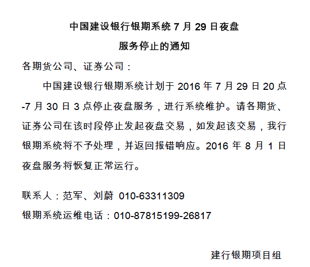 - 中國建設(shè)銀行銀行銀期系統(tǒng)7月29日夜盤服務(wù)停止的通知