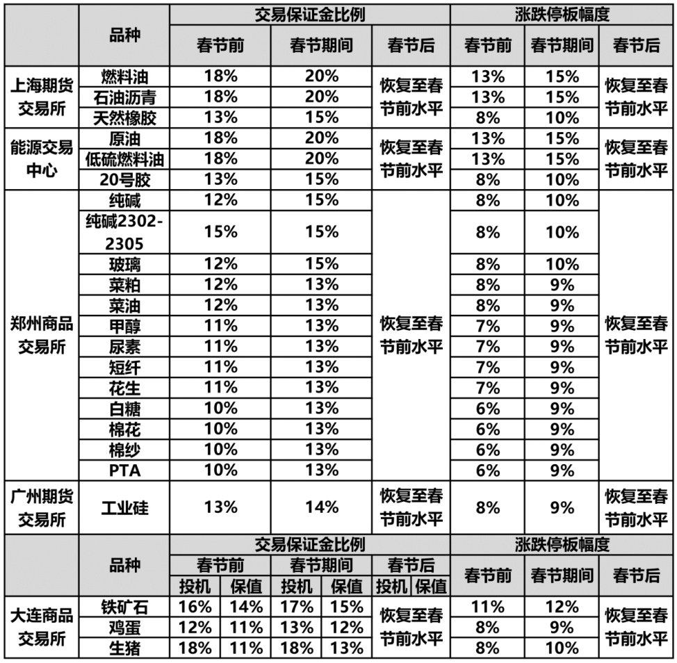 鄭州商品交易所、廣州期貨交易所、大連商品交易所:2023年1月30日恢復(fù)交易后,自品種持倉量最大的合約未出現(xiàn)漲跌停板單邊市的第一個交易日結(jié)算時起,上述品種期貨合約的交易保證金標(biāo)準(zhǔn)和漲跌停板幅度恢復(fù)至調(diào)整前水平。