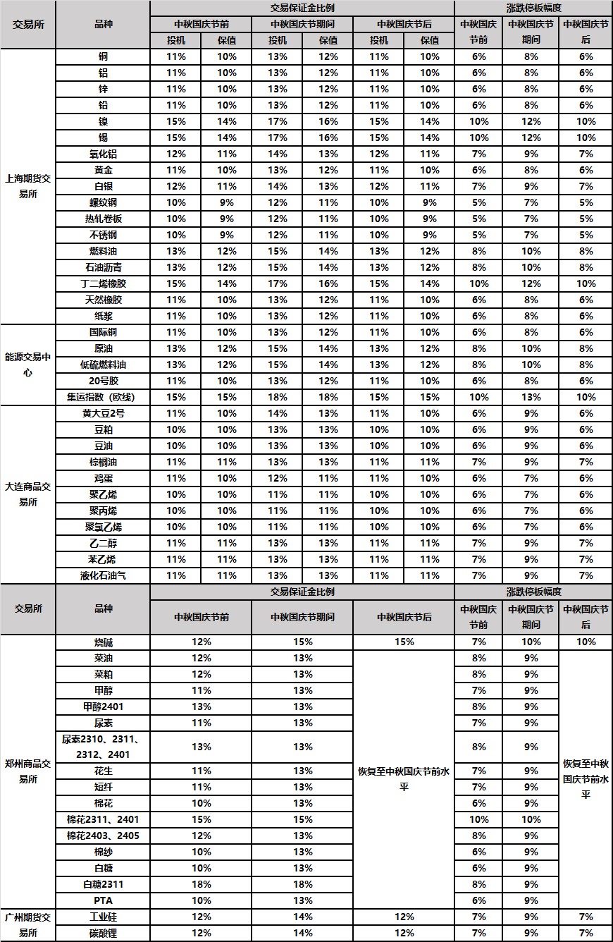 上海期貨交易所、上海國(guó)際能源交易中心:2023年10月9日(星期一)交易后,自第一個(gè)未出現(xiàn)單邊市的交易日收盤結(jié)算時(shí),漲跌停板幅度和交易保證金比例調(diào)整如下:所有品種期貨合約的漲跌停板幅度和交易保證金比例恢復(fù)至原有水平。