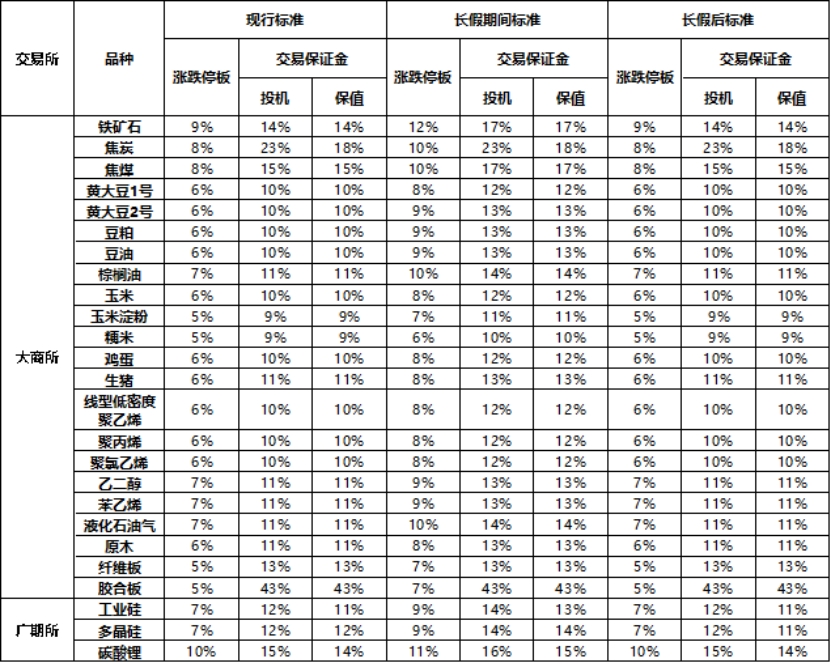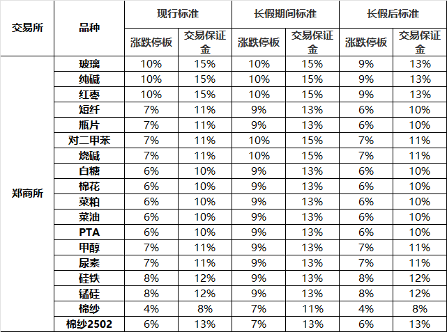 鄭州商品交易所:2025年2月5日(星期三)恢復(fù)交易后,自品種持倉量最大的合約未出現(xiàn)漲跌停板單邊市的第一個交易日結(jié)算時起,短纖、瓶片期貨合約的交易保證金標準為10%,漲跌停板幅度為6%;玻璃、純堿、紅棗期貨合約的交易保證金標準為13%,漲跌停板幅度為9%,其他品種期貨合約的交易保證金標準和漲跌停板幅度恢復(fù)至調(diào)整前水平。
