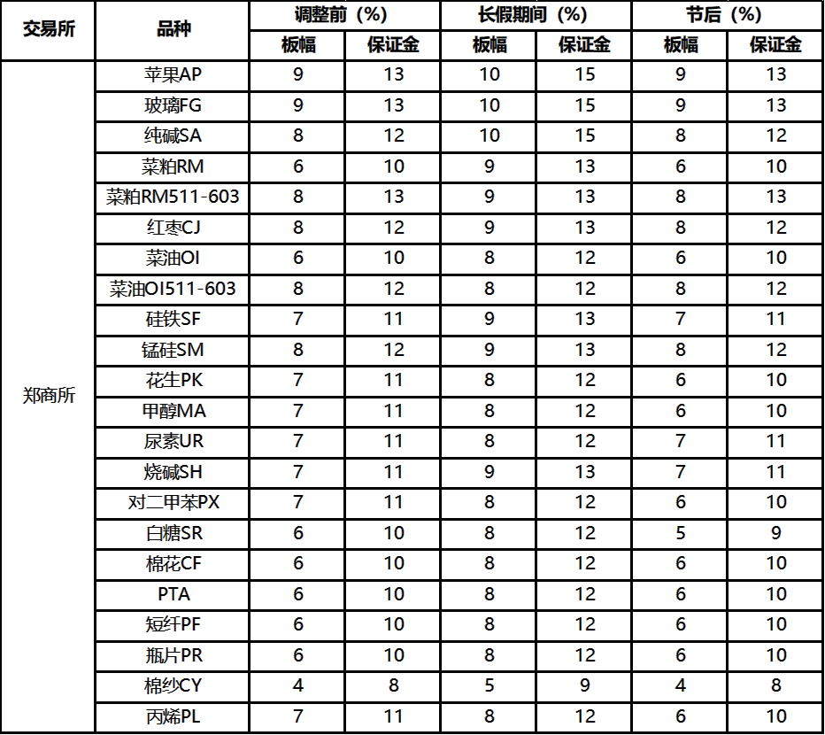 2025年10月9日恢復(fù)交易后,自品種持倉(cāng)量最大的合約未出現(xiàn)漲跌停板單邊市的第一個(gè)交易日結(jié)算時(shí)起,白糖期貨合約的交易保證金標(biāo)準(zhǔn)為9%,漲跌停板幅度為5%;花生、甲醇、對(duì)二甲苯及丙烯期貨合約的交易保證金標(biāo)準(zhǔn)為10%,漲跌停板幅度為6%;其他品種期貨合約的交易保證金標(biāo)準(zhǔn)和漲跌停板幅度恢復(fù)至調(diào)整前水平。