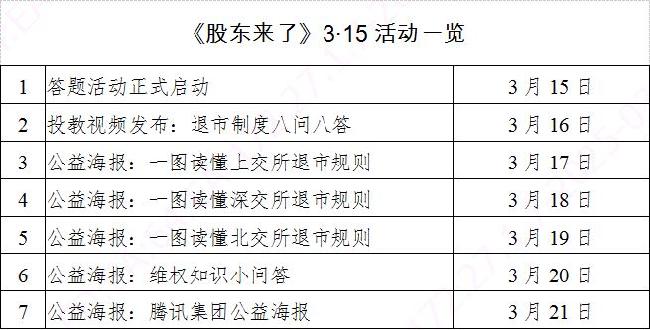 堅持理性投資,助力美好生活。在“3·15”國際消費者權(quán)益日來臨之際,中證投服中心積極踐行以投資者為本的理念,聯(lián)合上海、深圳、北京證券交易所以及騰訊集團(金融消費者權(quán)益保護部),共同推出《股東來了》3·15知識競答活動!