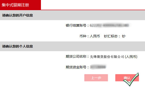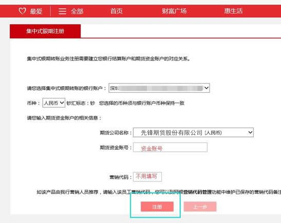 三、選擇“銀行賬戶”—選擇期貨公司“先鋒期貨股份有限公司”—按要求輸入資料—點(diǎn)擊注冊。