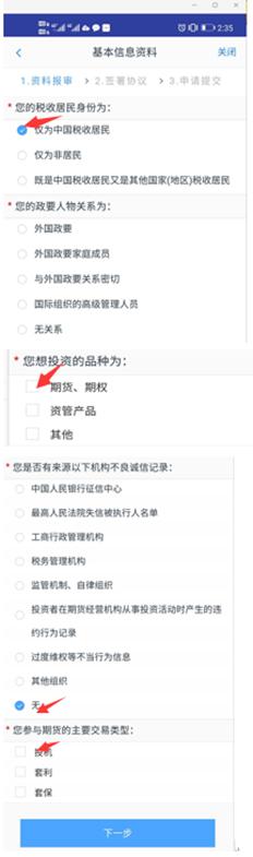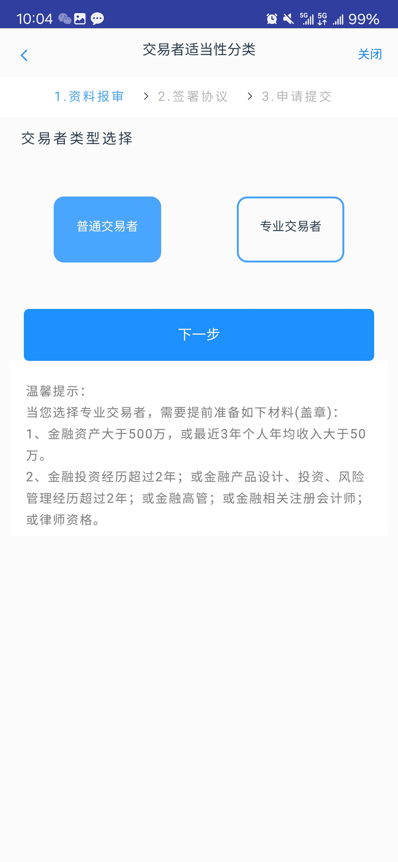 (5)進(jìn)入適當(dāng)性測(cè)評(píng)頁面。交易者適當(dāng)性分類是客戶根據(jù)自己實(shí)際情況選擇普通交易者還是專業(yè)交易者。如果選擇普通交易者,點(diǎn)擊“下一步”進(jìn)入到風(fēng)險(xiǎn)承受能力問卷頁面,選擇專業(yè)交易者,點(diǎn)擊“下一步”進(jìn)入到專業(yè)交易者信息采集問卷頁面。