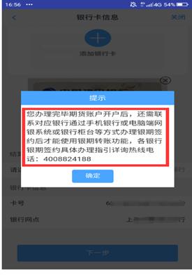 如果沒有業(yè)務(wù)經(jīng)理請(qǐng)聯(lián)系:0755-88267533,我們將給您安排一個(gè)專屬業(yè)務(wù)經(jīng)理 (4)進(jìn)入添加銀行卡信息頁面,上傳銀行卡照片后,頁面中展示自動(dòng)獲取的銀行卡基本信息。如果獲取的信息有不正確的地方可以自行修改,客戶可以根據(jù)需要同時(shí)上傳多張銀行卡。 若上傳銀行卡出現(xiàn)OCR識(shí)別失敗的情況,例如銀行卡磨損,模糊不清,或境外卡。系統(tǒng)會(huì)提示:“銀行卡識(shí)別失敗”,此時(shí)請(qǐng)?jiān)阢y行卡下面墊張白紙寫下卡號(hào)再拍照上傳,然后手動(dòng)填寫正確的銀行卡號(hào),則可以通過。 添加銀行卡注意事項(xiàng):1.系統(tǒng)自動(dòng)識(shí)別上傳的銀行卡卡號(hào),請(qǐng)仔細(xì)核對(duì)是否識(shí)別正確。 2.銀行網(wǎng)點(diǎn)格式為:**省**市**支行(或**省**市分行營(yíng)業(yè)部) 3.此處添加銀行卡僅為開戶時(shí)預(yù)留銀行卡信息,開戶成功后還需要客戶銀期簽約才能開通銀期轉(zhuǎn)賬功能。