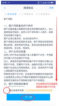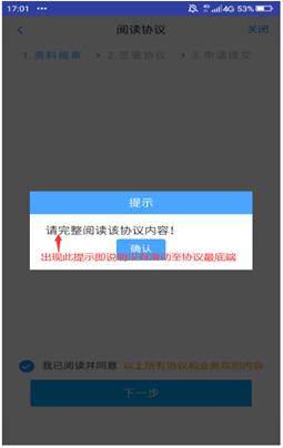 (6)進(jìn)入閱讀協(xié)議界面,協(xié)議需滑動(dòng)至頁面最底端閱讀完整才可勾選。