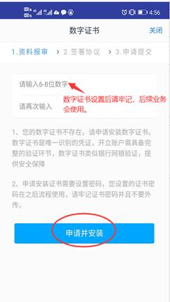 (8)視頻完成,下一步進(jìn)入數(shù)字證書安裝。建議客戶在開戶云進(jìn)行業(yè)務(wù)操作時(shí)使用同一設(shè)備操作,更換設(shè)備需要重新安裝數(shù)字證書。此處設(shè)置的密碼一定要記住,在之后的流程中會(huì)用到驗(yàn)證證書的密碼。否則,只能刪除本地證書文件,重新視頻驗(yàn)證、安裝證書才可通過。