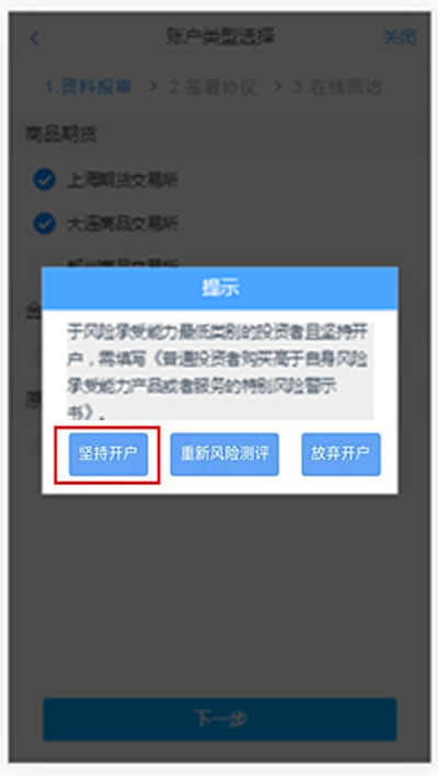 若交易者風(fēng)險(xiǎn)評(píng)測(cè)等級(jí)與選擇開立的期貨賬戶種類不匹配且堅(jiān)持開戶的,需要簽署《普通交易者購(gòu)買高于自身風(fēng)險(xiǎn)承受能力產(chǎn)品或者服務(wù)的特別風(fēng)險(xiǎn)警示書》。