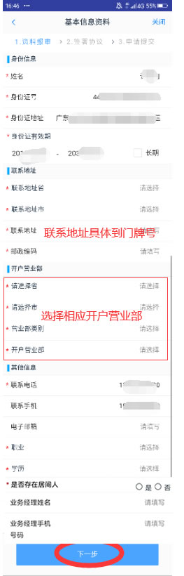 (3)所有照片都上傳成功以后,請(qǐng)閱讀“數(shù)字證書安全責(zé)任書”,閱讀完成并同意后點(diǎn)擊“下一步”進(jìn)入到“個(gè)人基本資料”頁面。資料填寫注意事項(xiàng):1.聯(lián)系地址具體到門牌號(hào) 2.營(yíng)業(yè)部依次按省、市對(duì)應(yīng)營(yíng)業(yè)部。 3.推薦人填對(duì)應(yīng)的居間人或客戶經(jīng)理。