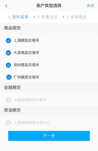 (5)進(jìn)入賬戶選擇界面。若是首次開戶的客戶,可選擇的期貨市場(chǎng)包括:上海期貨交易所、大連商品交易所、鄭州商品交易所、廣州期貨交易所; 如果客戶已經(jīng)擁有有效的中金所編碼,可同時(shí)勾選:中國(guó)金融交易所-交易; 如果客戶已經(jīng)擁有效的能源中心編碼,可同時(shí)勾選:上海國(guó)際能源中心。 注意事項(xiàng):1.如果客戶勾選了中國(guó)金融交易所-交易,可以開通中金所的交易品種(包括股指期貨,國(guó)債,股指期權(quán)等)。 2.如果客戶僅勾選了上海國(guó)際能源中心,只可以開通上海國(guó)際能源中心交易所中的20號(hào)膠、低硫燃料油等交易品種,不可以開通原油。 3.如果客戶同時(shí)勾選了中國(guó)金融交易所-交易和上海國(guó)際能源中心,可以開通中金所的交易品種(包括股指期貨,國(guó)債,股指期權(quán))和上海國(guó)際能源中心交易所的交易品種(包括20號(hào)膠、低硫燃料油、原油等)。
