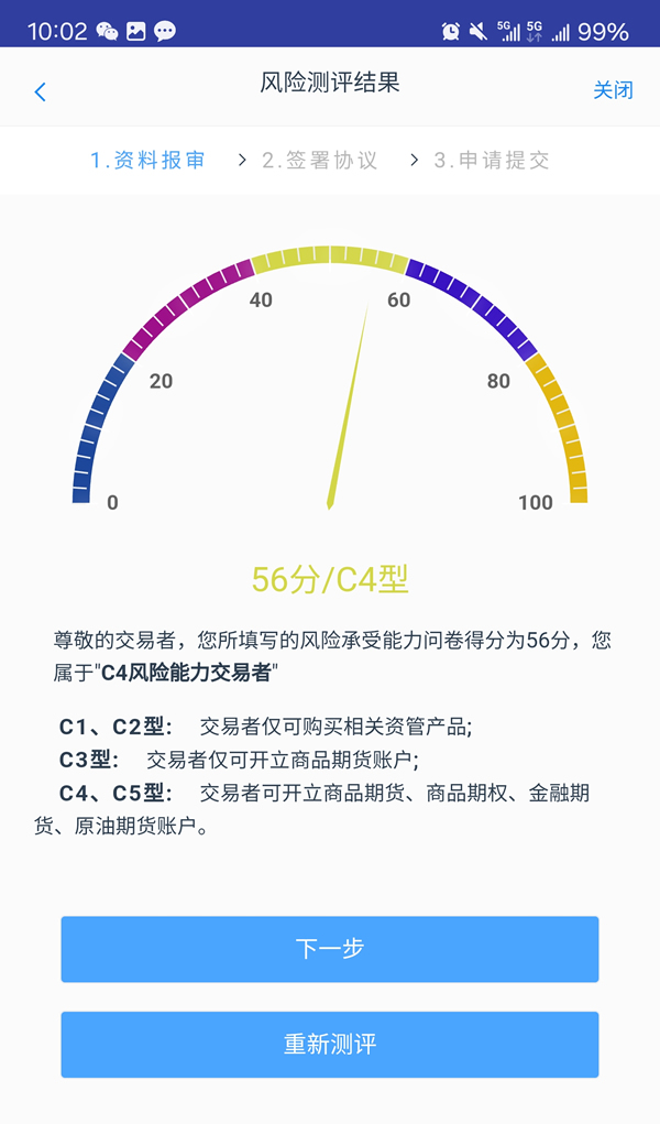 完成測(cè)評(píng)后,進(jìn)入風(fēng)險(xiǎn)測(cè)評(píng)結(jié)果界面,有分?jǐn)?shù)及相應(yīng)的等級(jí)。如對(duì)測(cè)評(píng)結(jié)果不滿意,可重新測(cè)評(píng);無異議點(diǎn)擊下一步。