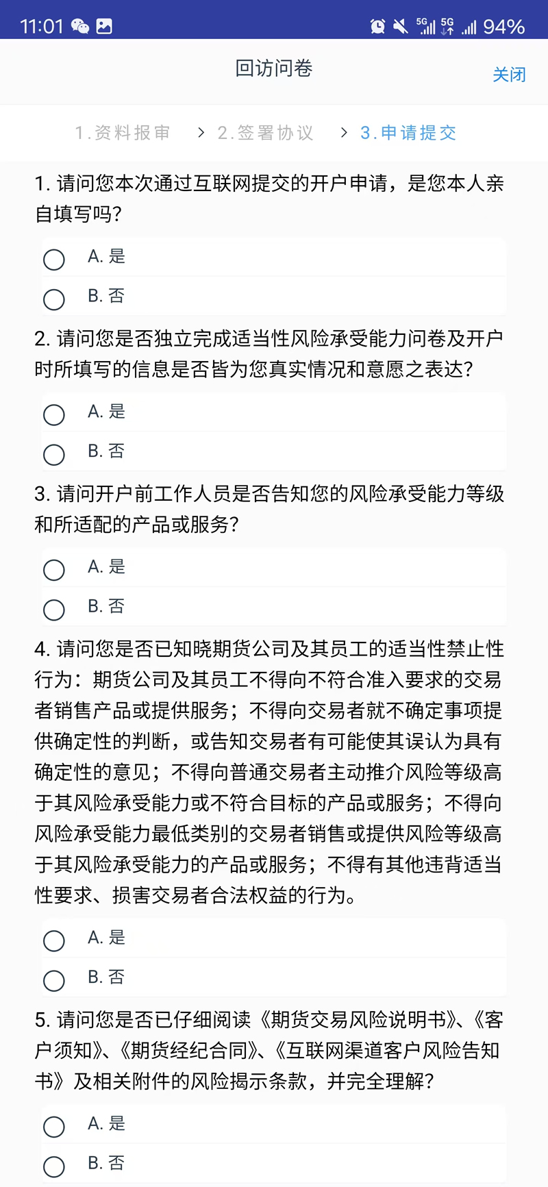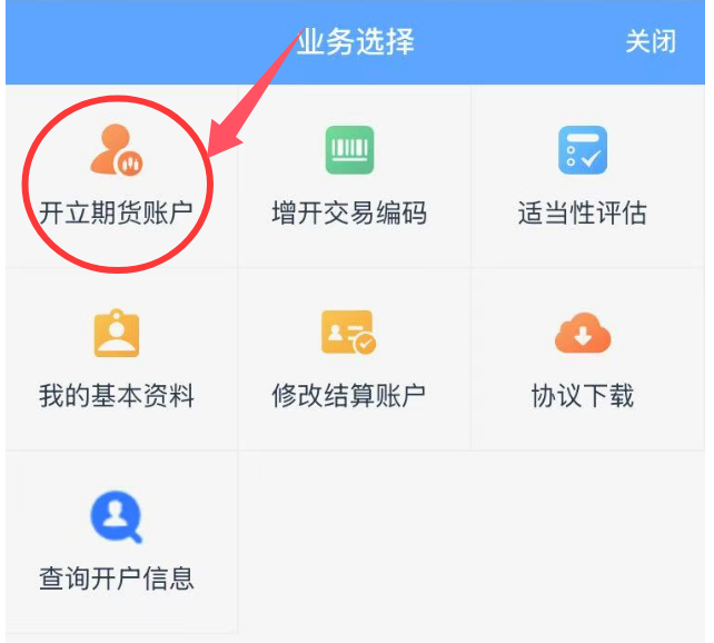 (1)開立期貨賬戶:新開期貨賬戶,選擇此項(xiàng)進(jìn)入下一步。 (2)修改結(jié)算賬戶:對(duì)于存量客戶,選擇此項(xiàng)可進(jìn)行增加或變更銀行卡信息。 (3)我的基本資料:對(duì)于存量客戶,選擇此項(xiàng)可進(jìn)行修改客戶一般信息(如身份證有效期、聯(lián)系電話、聯(lián)系地址、郵編、學(xué)歷等) (4)適當(dāng)性評(píng)估:對(duì)于存量客戶,選擇此項(xiàng)可重新進(jìn)行適當(dāng)性測(cè)評(píng)。 (5)協(xié)議下載:對(duì)于存量客戶,選擇此項(xiàng)可下載已簽署的開戶協(xié)議。 (6)增開交易編碼:對(duì)于存量客戶,選擇此項(xiàng)可申請(qǐng)其他未開通的交易所編碼。