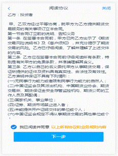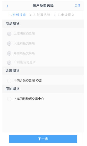 (4)下一步進入賬戶選擇頁面。在賬戶選擇頁面,展示出客戶在本期貨公司已開通的交易所信息并做置灰處理,對已開通的交易所不允許客戶對其進行修改,客戶可以勾選想要開通的交易所。此項業(yè)務根據(jù)我司開戶流程,暫時只接受中金所和能源中心的二次開戶(即已在其他公司開通過中金所或能源中心的交易編碼,且未銷戶)。