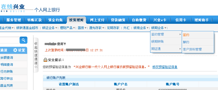 興業(yè)銀行個人銀期轉(zhuǎn)賬網(wǎng)銀簽約指南 網(wǎng)銀簽約:(手機app辦理銀期指引) 第一步:登陸興業(yè)銀行,進入網(wǎng)上銀行,登錄成功后,點擊”投資理財”——“銀期業(yè)務(wù)”——“簽約”; 如圖: