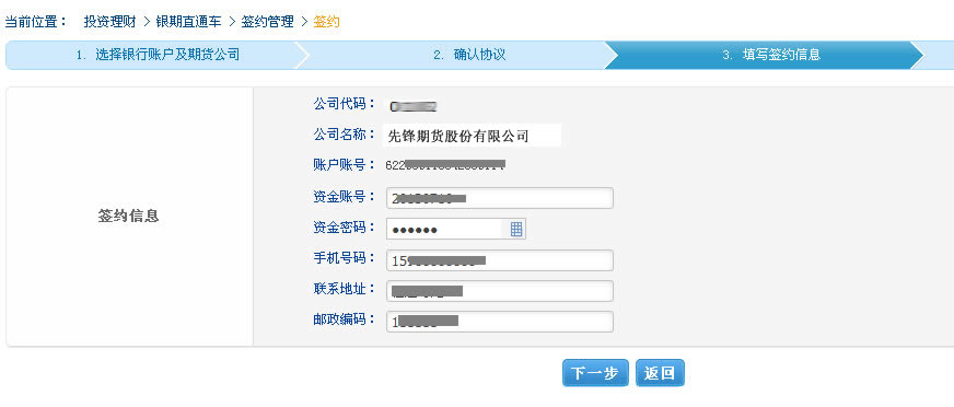 第三步:填寫期貨資金賬號和密碼等信息,選擇下一步完成簽約;