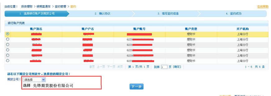第二步:選擇綁定的銀行卡和期貨公司,點擊下一步;