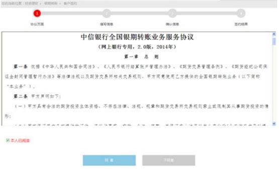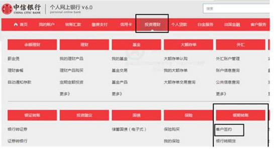 第二步:登錄成功后,點擊”投資理財”——“銀期轉賬”——“客戶簽約”;