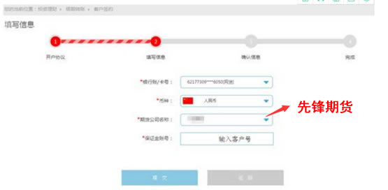 第四步:選擇期貨公司“先鋒期貨”,輸入綁定的銀行卡賬號和期貨資金賬戶等信息,點擊“確定”即可完成簽約;