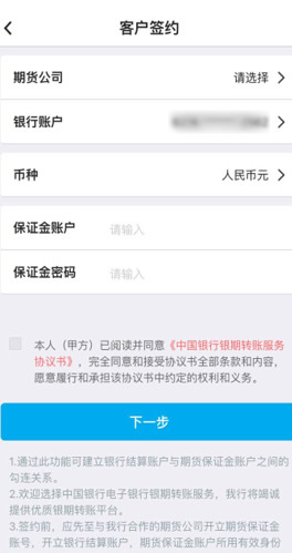 選擇“期貨公司”、輸入“保證金賬戶”、“保證金密碼”、勾選“已閱讀并同意”、點擊“下一步”。