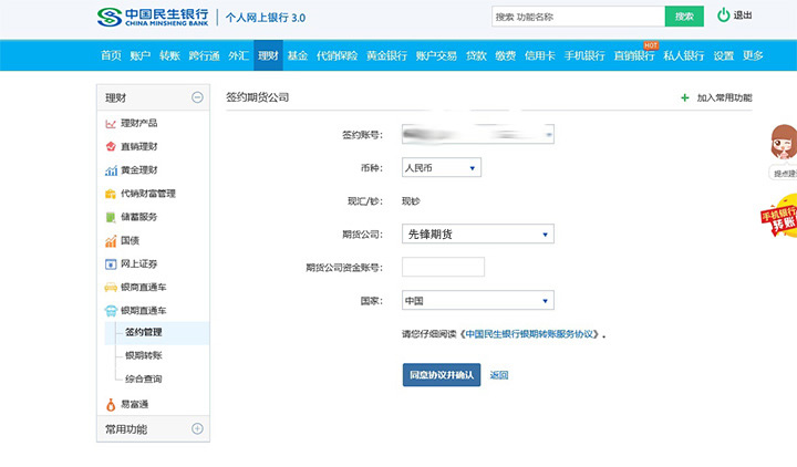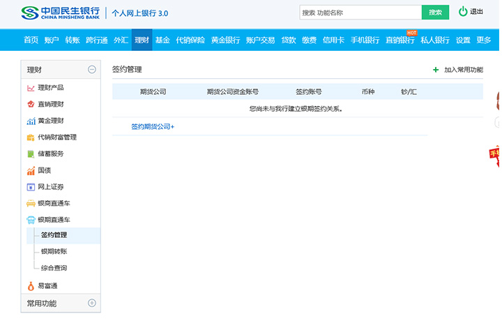 點(diǎn)擊“理財”—“銀期直通車”—簽約管理