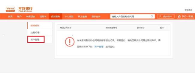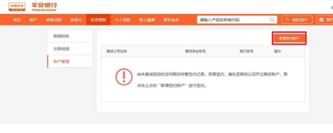 進入銀期業(yè)務界面后,若尚未在期貨公司有關聯(lián)信息,會有相應提示,您可選擇右側“賬戶管理“進入簽約界面
