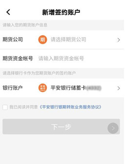 期貨公司名稱處選擇“先鋒期貨”,隨后在期貨資金賬號處填寫在我司獲得的資金賬號,勾選正方形方框“我已閱讀并確認”,再點擊下一步