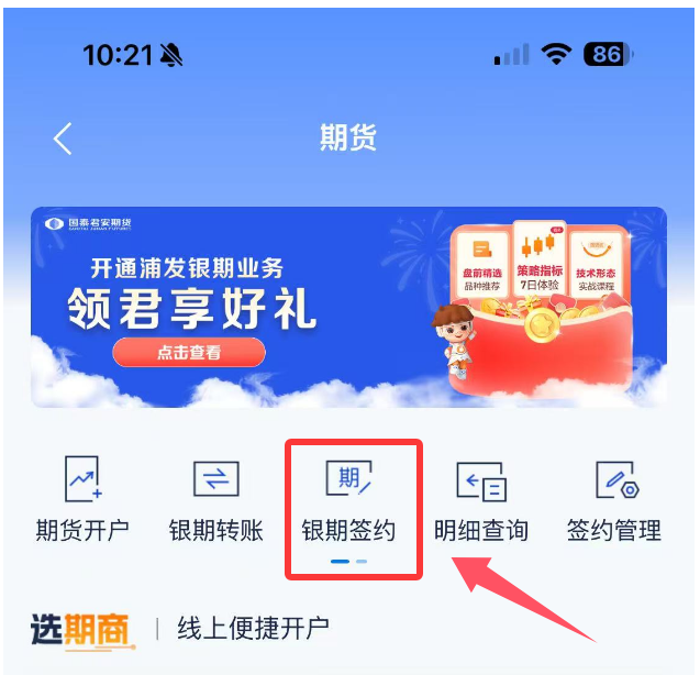 第一步:打開浦發(fā)銀行手機(jī)APP,登錄手機(jī)銀行,在上方搜索框輸入“期貨”,選中“期貨”-“銀期簽約”。