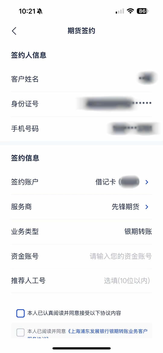 第二步:在“銀期簽約”欄目下點(diǎn)擊“新增銀期簽約”,在“服務(wù)商”處找到“先鋒期貨”,填寫并確認(rèn)基本信息,在“資金賬號”處輸入您的“期貨資金賬號”,