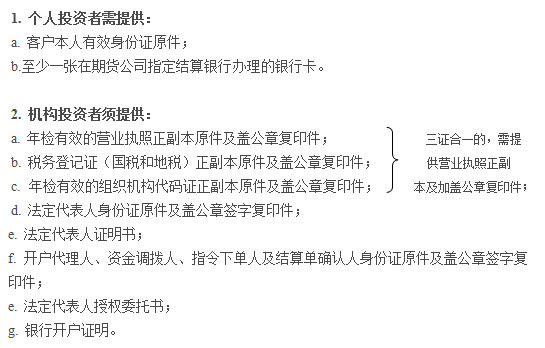 二、金融期貨客戶開戶特殊要求 1. 申請開戶時保證金賬戶可用資金余額不低于人民幣50萬元; 2. 具備股指期貨基礎(chǔ)知識,通過相關(guān)測試; 3. 具有累計10個交易日、20筆以上的股指期貨仿真交易成交記錄,或者最近三年內(nèi)具有10筆以上的商品期貨交易成交記錄; 4. 不存在嚴重不良誠信記錄;不存在法律、行政法規(guī)、規(guī)章和交易所業(yè)務(wù)規(guī)則禁止或者限制從事股指期貨交易的情形。 三、客戶還須滿足以下開戶條件 1. 自然人投資者:期貨公司對投資者的基本情況、相關(guān)投資經(jīng)歷、財務(wù)狀況和誠信狀況等進行綜合評估,評估得分不滿足要 求的不能開立股指期貨交易編碼。 2. 一般法人投資者: a.指定下單人參與股指考試; b. 參與金融期貨交易的內(nèi)部控制風險管理等相關(guān)制度(加蓋公章); |